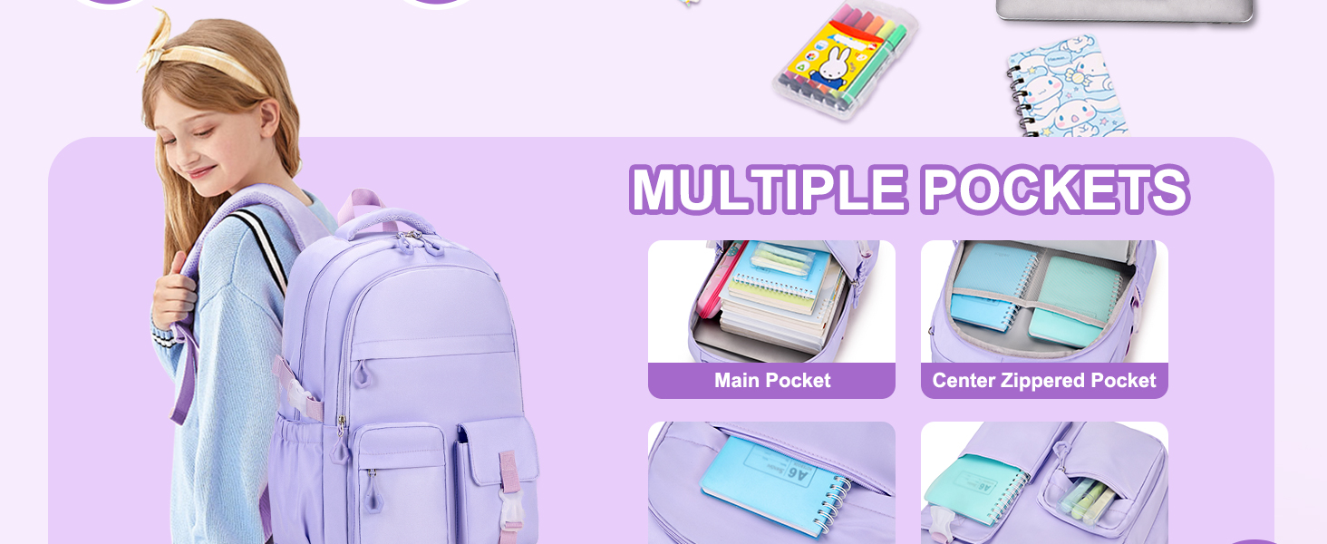 【充足的存储空间】背包尺寸:长 12.2 英寸 * 宽 6.2 英寸 * 高 17.2 英寸。 这款女孩背包内部有多个隔层,包括一个专用的笔记本电脑隔层和多个小口袋,可存放各种文具、书籍、水瓶和个人物品。 这款青少年女孩背包的设计不仅帮助孩子快速找到他们需要的东西,而且还帮助他们培养良好的整理习惯。